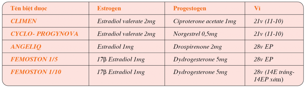 Các dạng phối hợp hormon Estrogen và Progestogen thường dùng