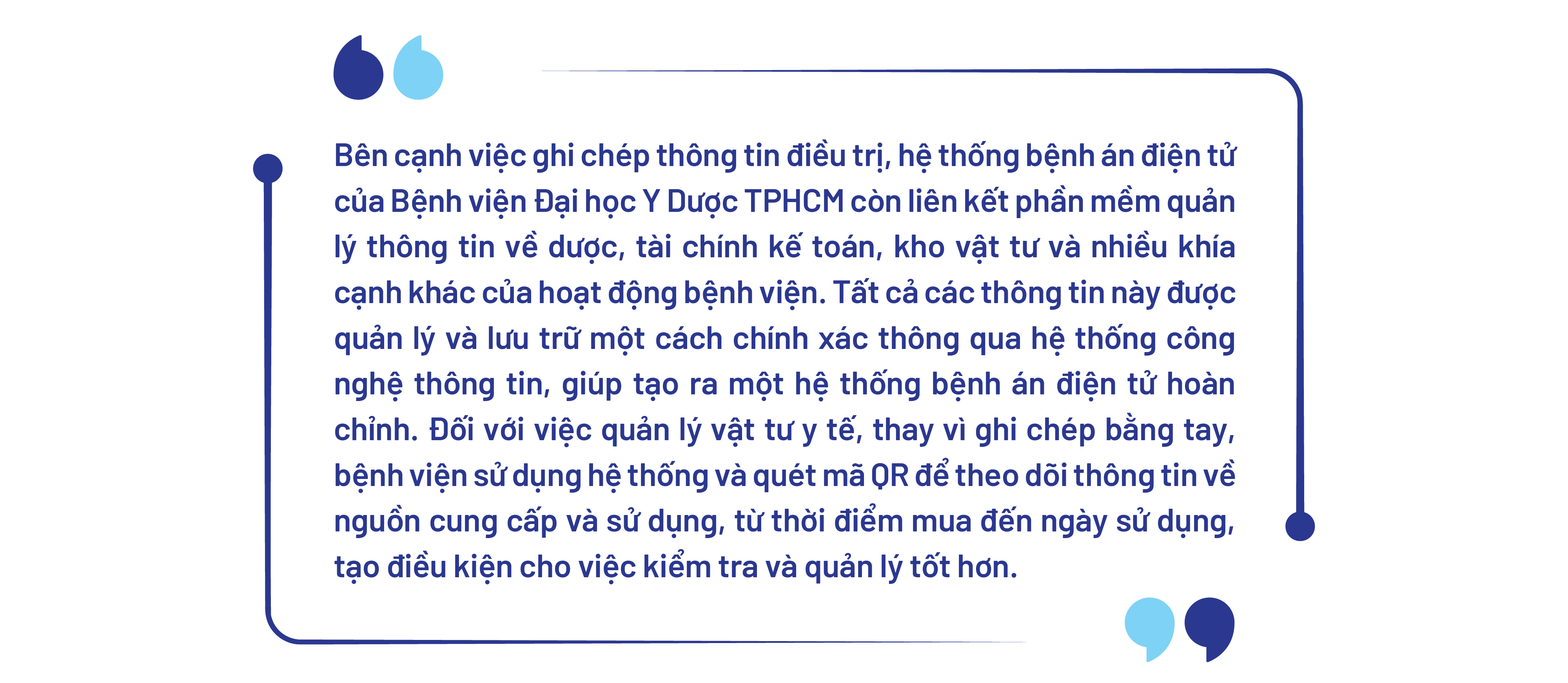 Phần mềm Bệnh án điện tử của Bệnh viện Đại học Y Dược TPHCM gồm nhiều phân hệ chức năng như Nội trú, Ngoại trú, Dược, Quản lý Kho hồ sơ, Bảo hiểm y tế, Tài chính,… Các phân hệ của phần mềm bệnh án điện tử được xây dựng hoàn chỉnh và liên thông với nhau để không những phục vụ công tác chuyên môn, công tác quản trị mà còn phục vụ chăm sóc khách hàng, nâng cao trải nghiệm cho người bệnh. TS.BS Lê Quan Anh Tuấn khẳng định tính hợp nhất lớn nhất của công nghệ thông tin trong khám chữa bệnh là hồ sơ bệnh án điện tử. Mặc dù khái niệm bệnh án điện tử đã được Bộ Y tế ban hành tuy nhiên đây không chỉ là việc chuyển từ viết tay sang đánh máy, mà còn là việc cải thiện quản lý thông tin bệnh án và dữ liệu. Cho đến thời điểm hiện tại, Bệnh viện Đại học Y Dược TPHCM đã áp dụng nhiều ứng dụng công nghệ thông tin để phục vụ người bệnh, nhưng bệnh án điện tử vẫn là một trong những ứng dụng nổi bật nhất. Bệnh án điện tử tại Bệnh viện Đại học Y Dược TPHCM hoàn toàn không sử dụng giấy và các trường thông tin được mã hóa, áp dụng bộ mã SNOMED. Cả bác sĩ và nhân viên y tế liên quan đến việc điều trị bệnh nhân đều sử dụng hồ sơ bệnh án điện tử, đặc biệt là phân hệ cho điều dưỡng. Một ví dụ cụ thể trong việc phát thuốc cho người bệnh. Bằng cách sử dụng thiết bị như máy tính bảng, các điều dưỡng có thể quét mã vạch trên đơn thuốc và xác nhận thông tin của bệnh nhân. Hệ thống sau đó sẽ xác nhận danh sách thuốc và liều lượng cần phải phát cho bệnh nhân. Sau khi giải thích cho người nhà về từng loại thuốc, họ sẽ ký xác nhận trên hệ thống, giúp giảm thiểu sai sót. Điều này giúp tăng tính chính xác và giảm thiểu sự nhầm lẫn trong quá trình điều trị. TS.BS Lê Quan Anh Tuấn cho biết bệnh viện cũng đã phát triển phần mềm dành cho người bệnh "UMC Care", cho phép bệnh nhân đăng ký và quản lý thông tin cá nhân của mình hoặc của người thân một cách liên tục lâu dài. Thông tin về điều trị và sức khỏe được lưu trữ và truy cập dễ dàng. Khác với việc sử dụng giấy cho các hồ sơ bệnh án, với quy định lưu trữ chỉ từ 10 đến 30 năm, hồ sơ điện tử được lưu trữ lâu dài và có thể được chia sẻ giữa các cơ sở y tế .