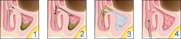 4. Nông lỗ thông xoang bằng bong bóng là một thủ thuật ít xâm lấn giúp bệnh nhân giảm các triệu chứng VMXMT. Bác sĩ đưa một ống thông bóng mềm vào lỗ thông xoang được hỗ trợ bởi một sợi dây nhỏ với đèn pin ở đầu để giúp điều hướng. Khi quả bóng được đặt đúng vị trí, bóng sẽ được bơm căng để mở thông xoang. Bác sĩ dùng dung dịch nước muối sinh lý để giúp đẩy chất nhầy và mủ ra ngoài.