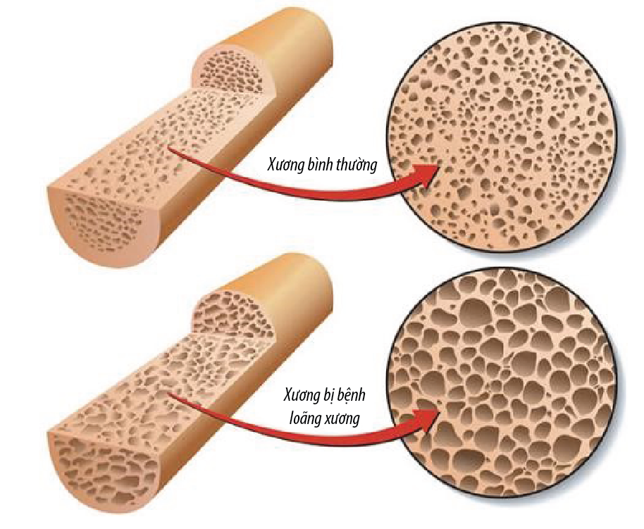 Cấu tạo xương người là một mạng lưới các bè xương liên kết với nhau. Ở người bình thường, bè xương có số lượng dầy đặc và cấu trúc toàn vẹn, tạo nên bộ khung vững chắc nâng đỡ cơ thể. Ở người bị loãng xương, bè xương suy giảm cả lượng lẫn chất, xương trở nên xốp, giòn và dễ gãy.