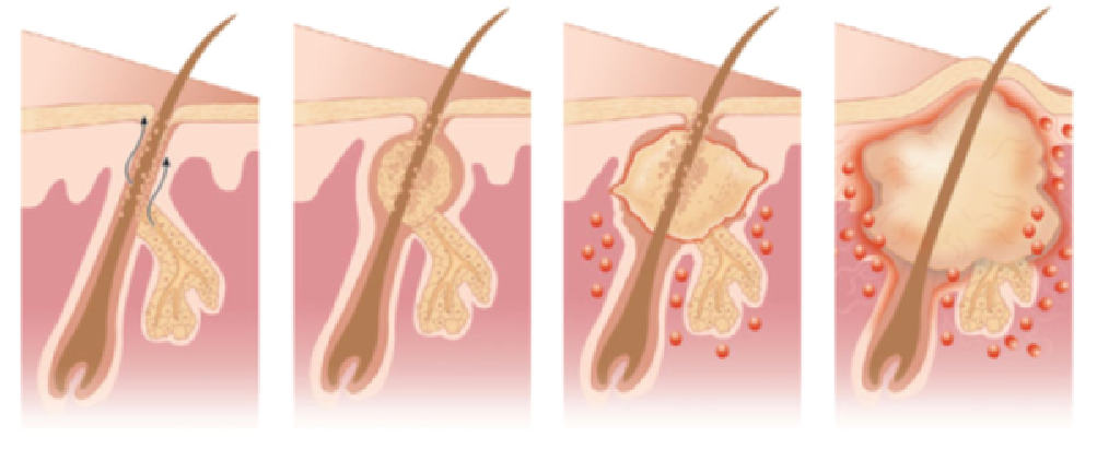Hiện tượng viêm: Các nhân mụn ngày càng tăng kích thước do tập trung ngày càng nhiều chất sừng, chất bả, vi khuẩn. Khi các còi mụn này vỡ ra sẽ gây nên hiện tượng viêm. Một số nghiên cứu cũng ghi nhận có thể hiện tượng viêm đã có trước khi nhân mụn được hình thành.