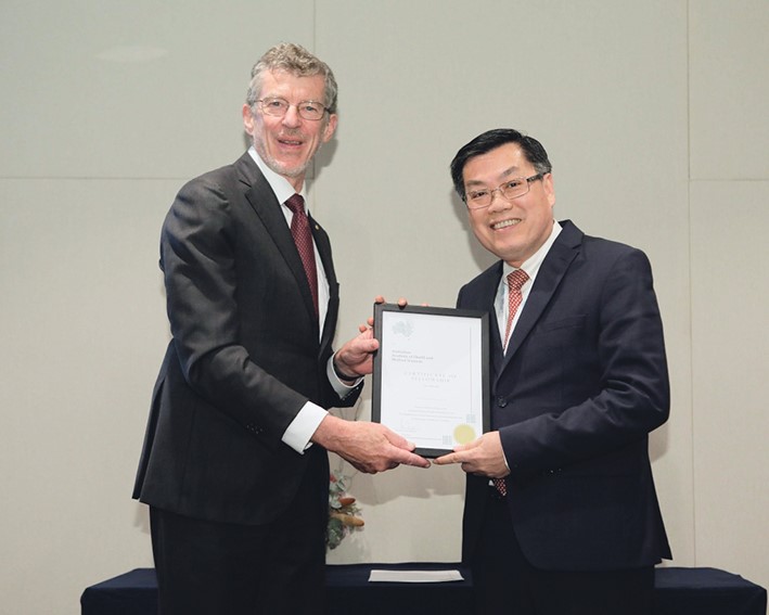 Giáo sư Ian Frazer, Chủ tịch Viện hàn lâm y học Australia trao chứng chỉ cho Giáo sư Nguyễn Văn Tuấn trong buổi lễ kết nạp tân viện sĩ Viện hàn lâm.